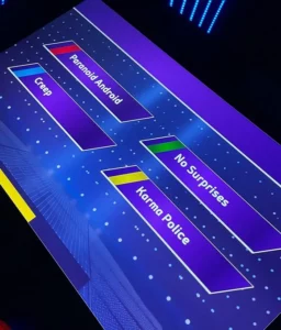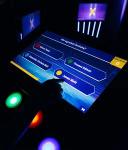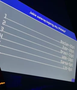 Interaktywny quiz na żywo z wirtualnym prowadzącym, muzyką i efektami świetlnymi.